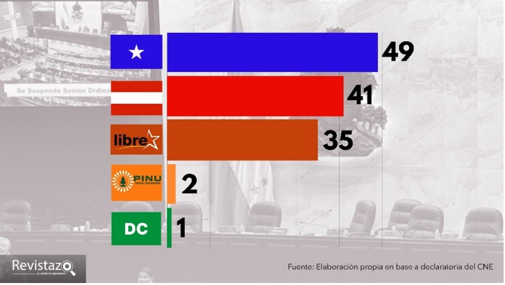 Serán 128 diputados propietarios los que ocuparán los curules, distribuidos entre 49 de Partido Nacional, 41 del Partido Liberal, 35 de Libertad y Refundación (Libre), dos del Partido Innovación y Unidad Social Demócrata (PINU/SD) y uno de Democracia Cristiana. Ningún partido político tendrá control total de Congreso, cada decisión importante requerirá dialogo, acuerdos y -sobre todo- voluntad política.