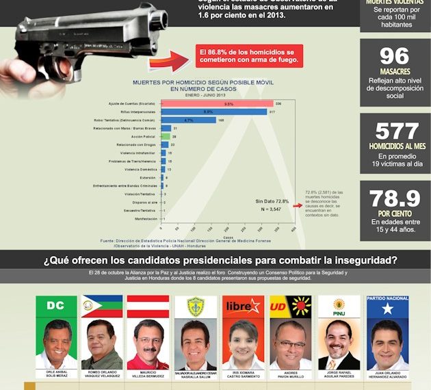 Con una tasa de 85.5 homicidios por cada 100 mil habitantes Honduras sigue siendo el país más violento del mundo. Entre enero y septiembre de 2013 el Observatorio de la Violencia de la Universidad Nacional Autónoma de Honduras (UNAH) contabilizó 96 masacres que prueban la intensidad de la criminalidad en el país. Las autoridades estiman que a para finales de año la tasa de homicidios se reducirá de 85.5 a 83. No obstante, el Observatorio de la Violencia asegura que las masacres incrementaron en 1.6 por ciento.